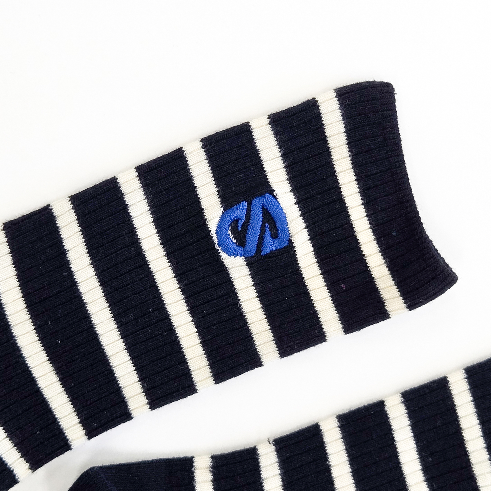 コーディネートのアクセントにもなるボーダーにレイクスのエンブレムを刺繍プリントしました☺️
