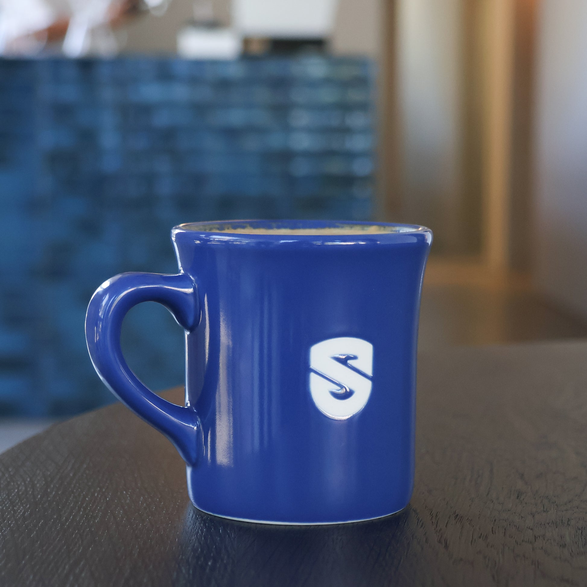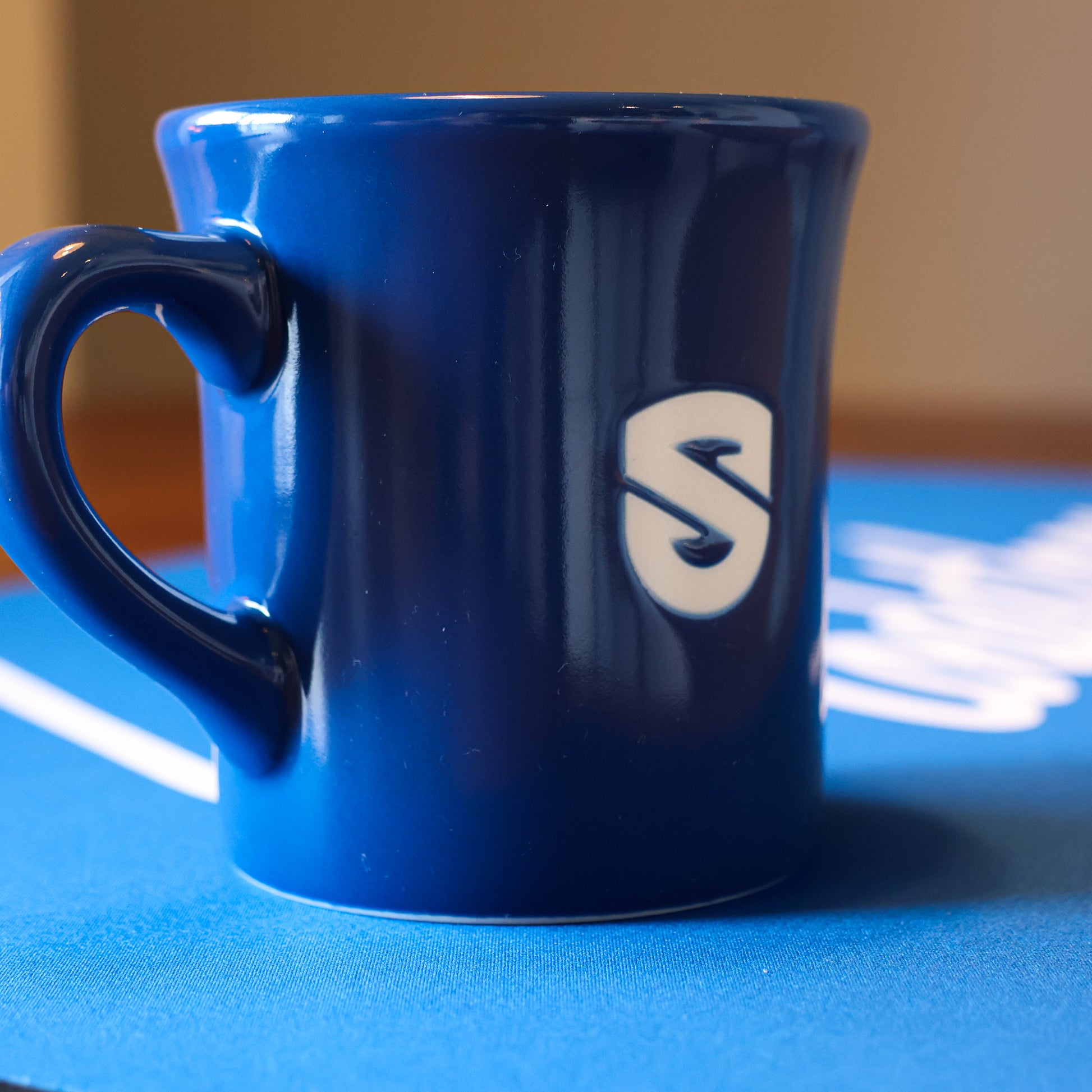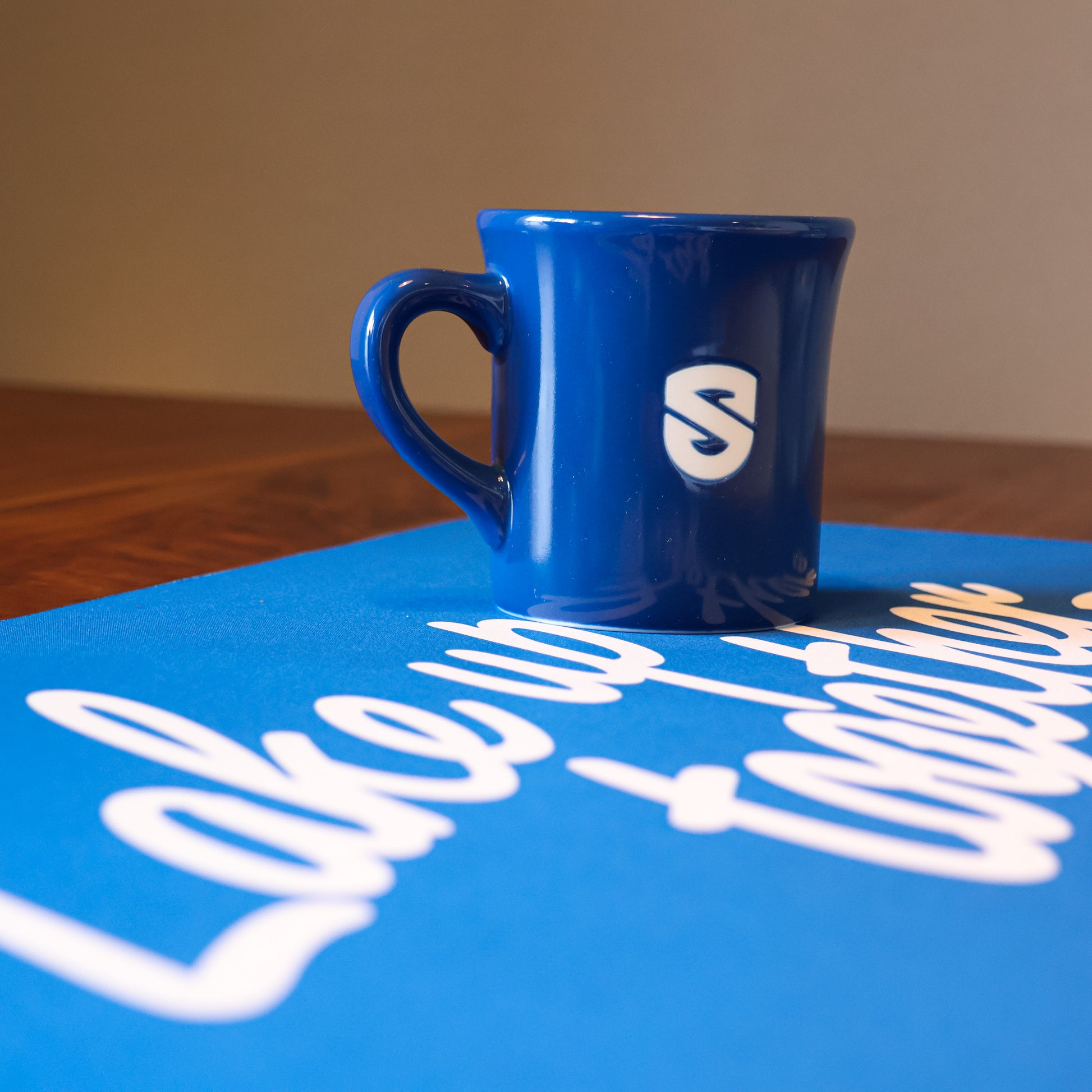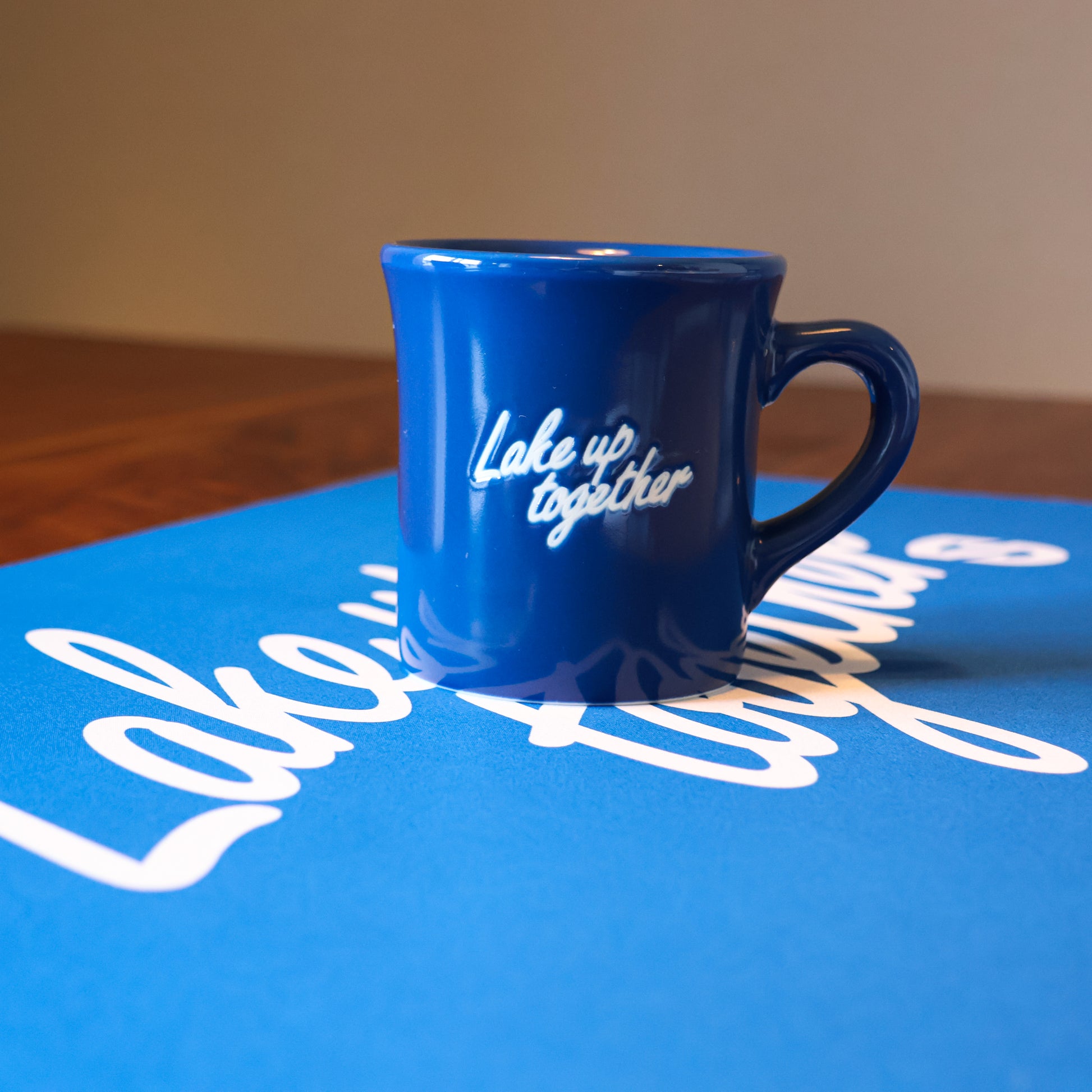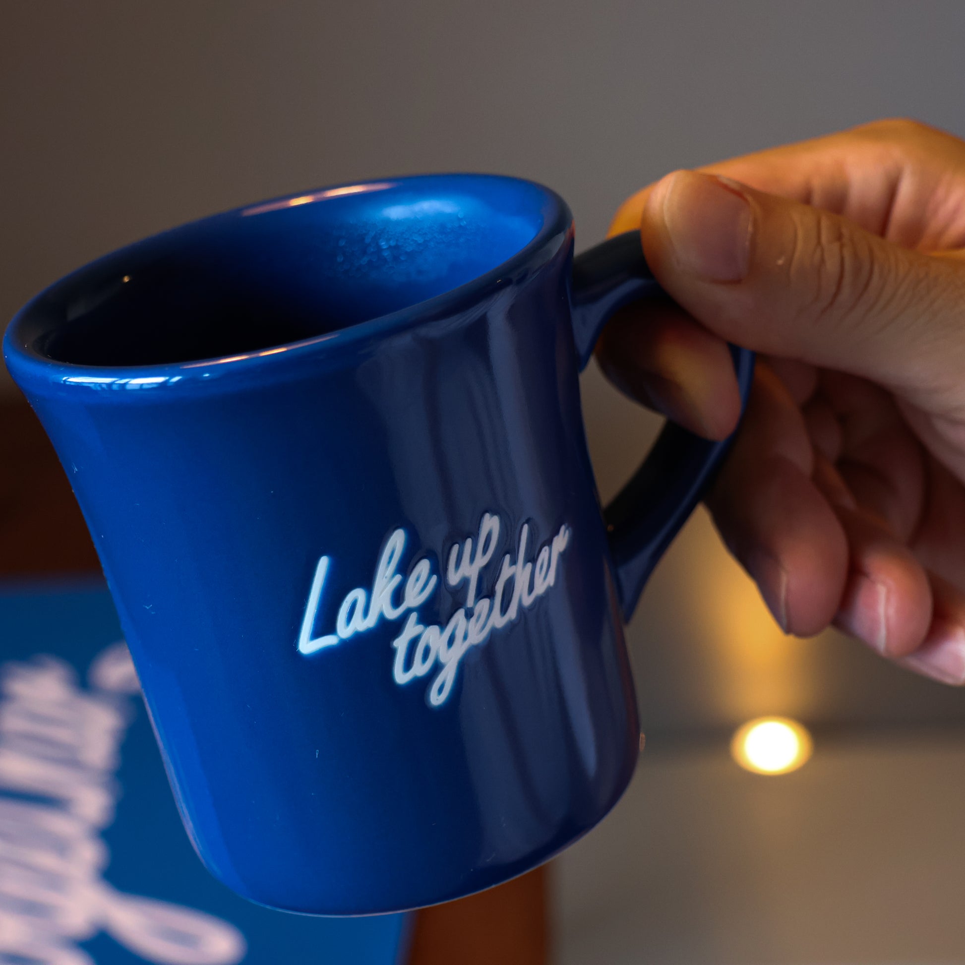 Introducing a mug with our new corporate slogan, " Lake up together "