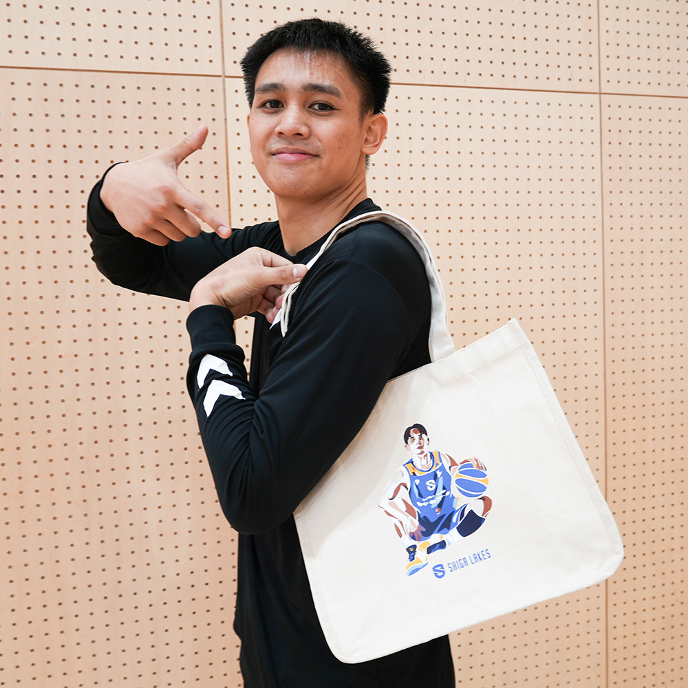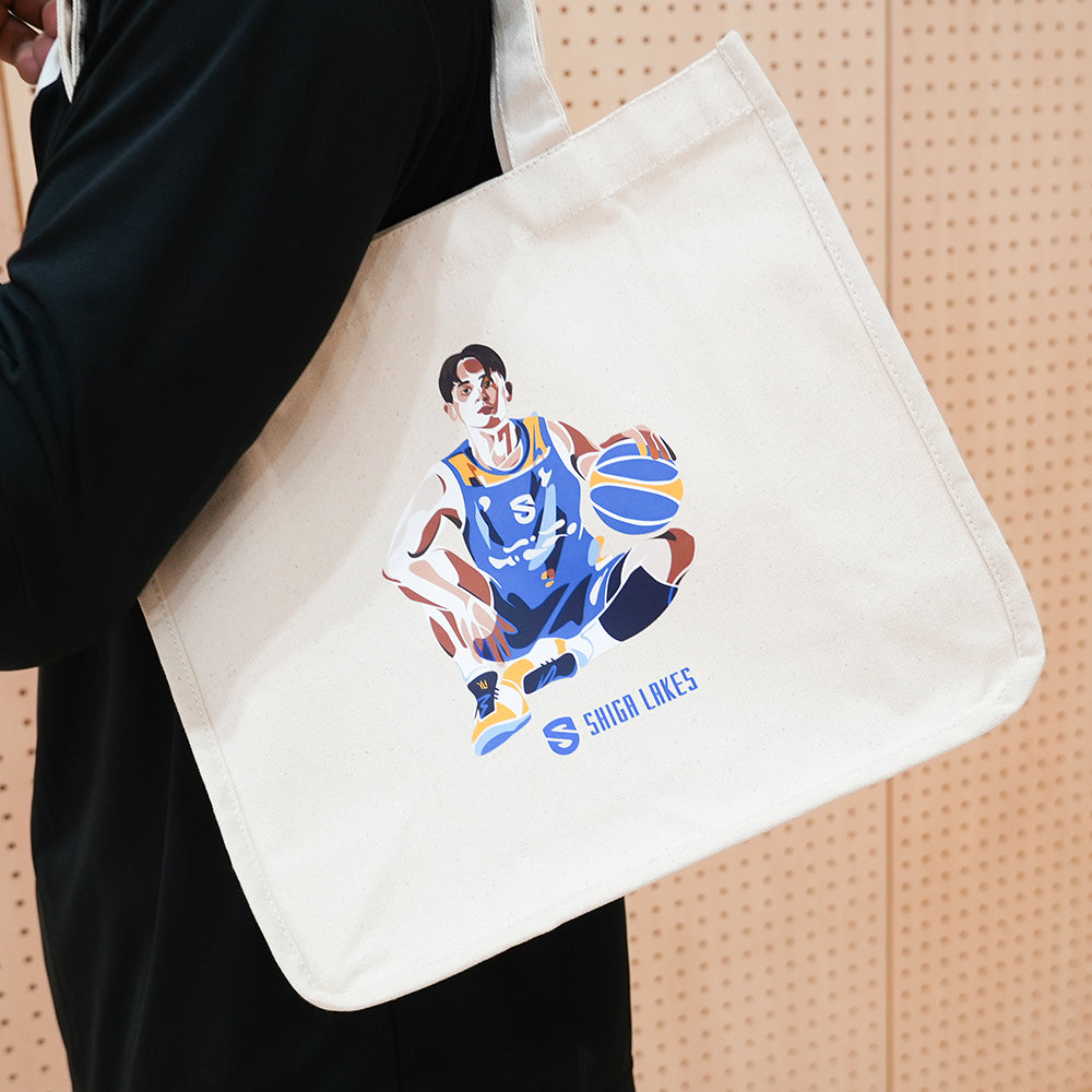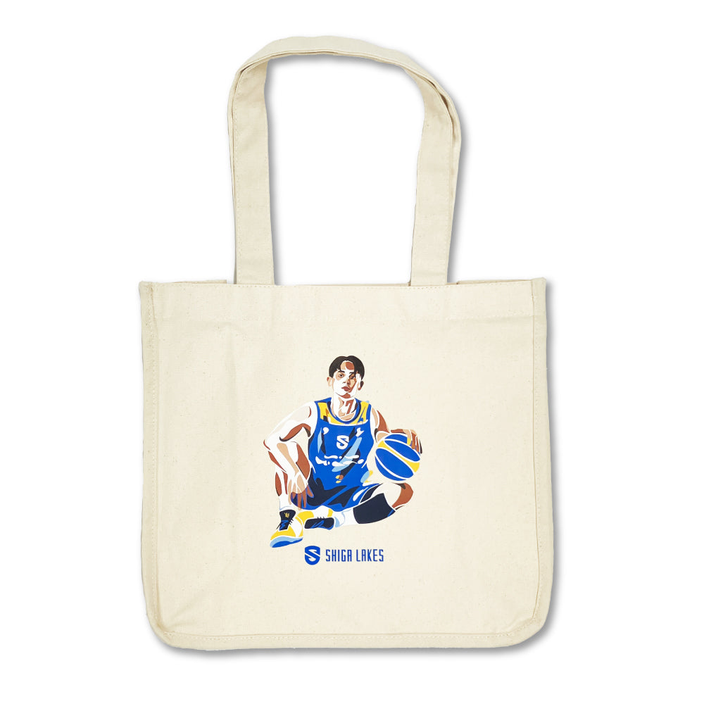 A stylishly drawn image of Yu is printed on a canvas tote bag.
