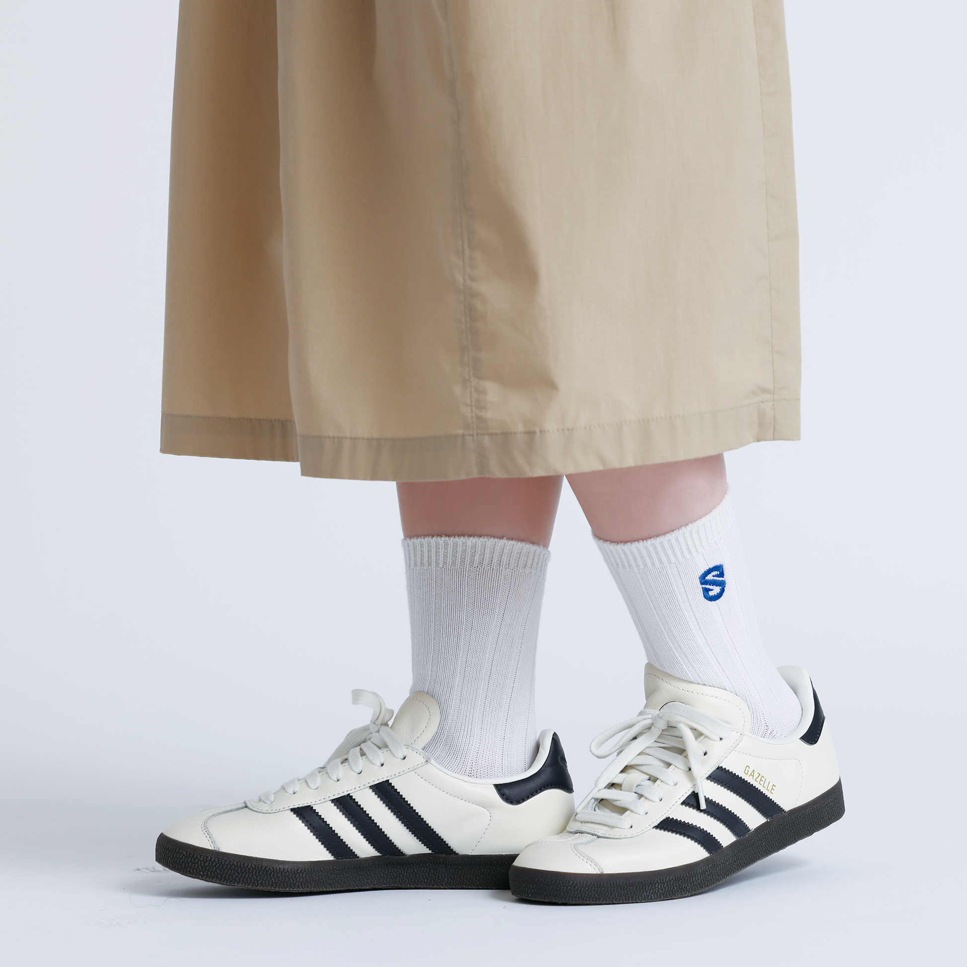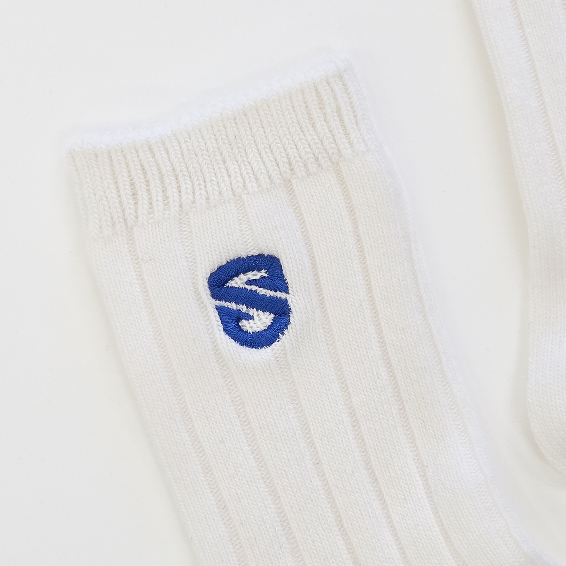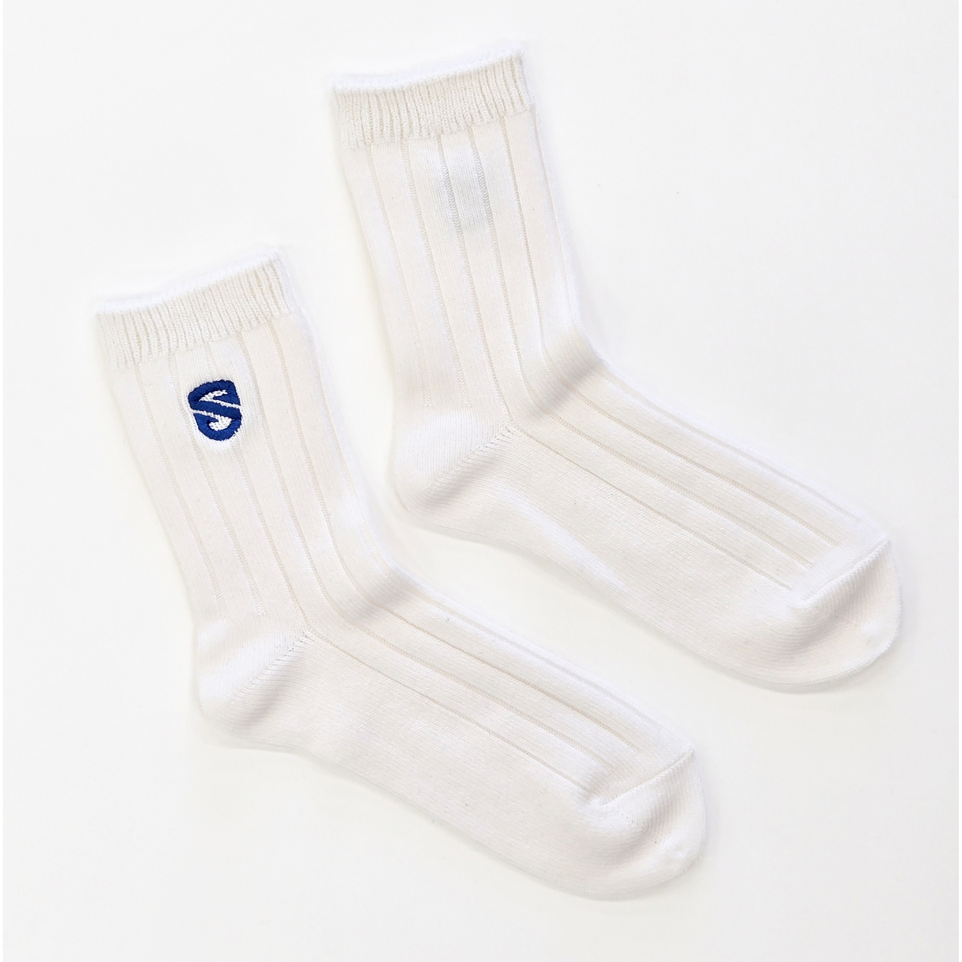 白のリブソックスにエンブレムの刺繍が入った潔くシンプルなデザイン。