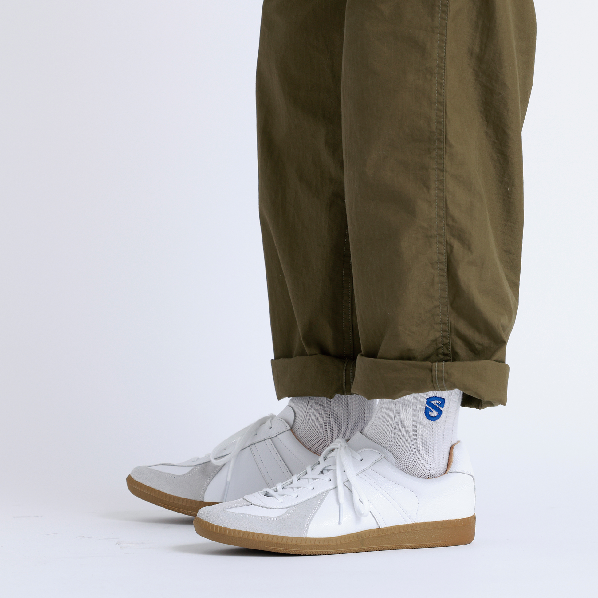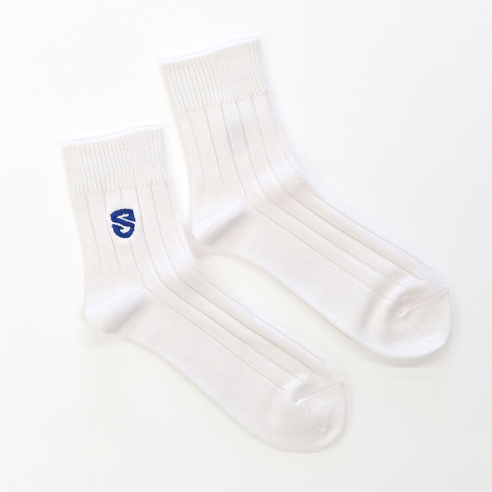 白のリブソックスにエンブレムの刺繍が入った潔くシンプルなデザイン。